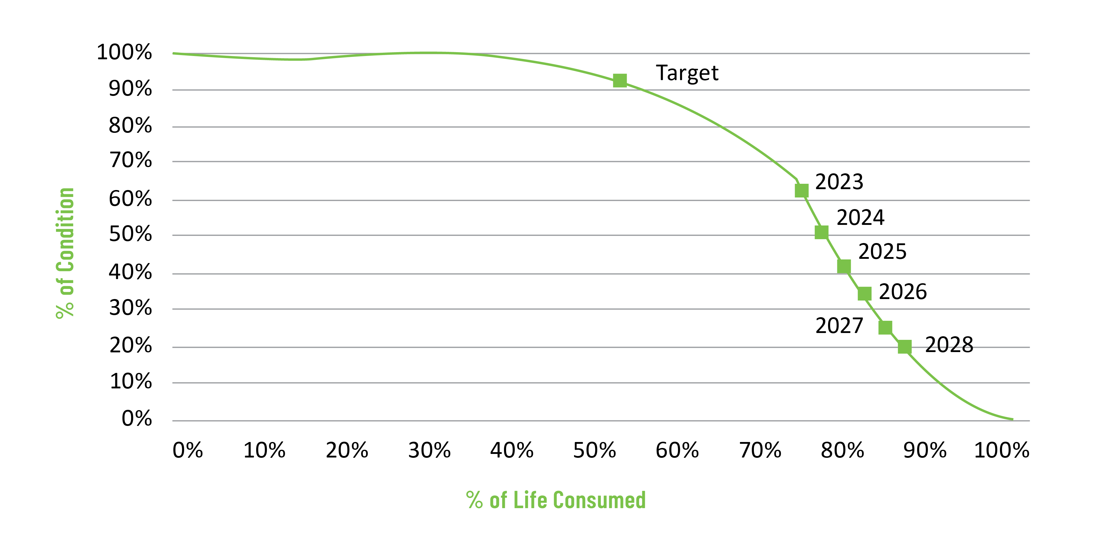 Note: This graph provides an estimate of future conditions and may not align precisely with the life consumed shown in the subsequent chart. While both are closely related, the chart figures should be considered more accurate in representing future conditions.